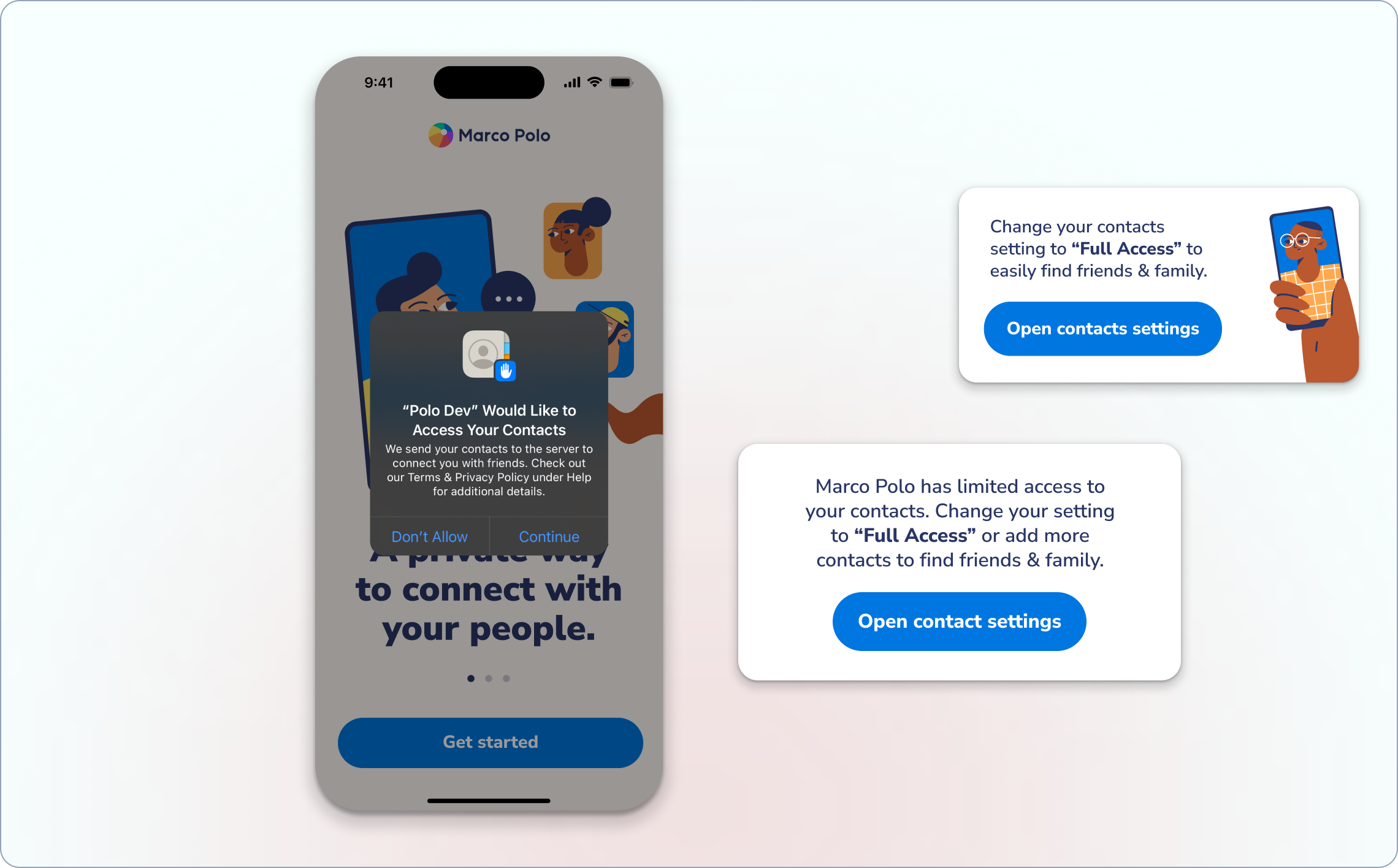 When iOS 18 launched, Apple introduced more granular contact permissions: users could now choose "limited access" instead of the traditional all-or-nothing approach. While this was great for privacy, it meant more users were entering Marco Polo without any visible contacts for us to recommend. We were essentially dumping people into an empty room and expecting them to figure out how to invite their friends.