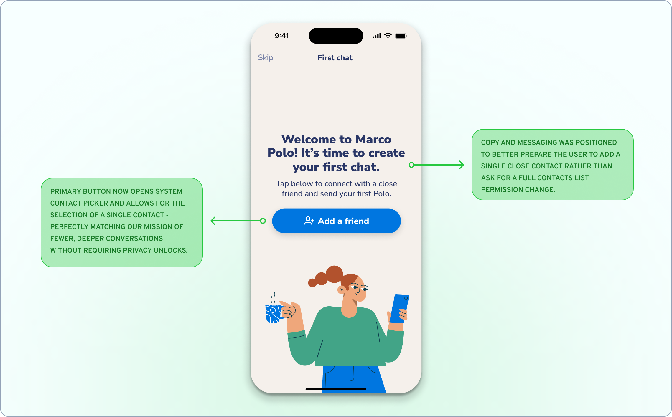 Instead of asking users to hand over their entire contact list, what if we made it easier to add just one person? After all, a big part of our mission at MP was to connect with close, meaningful contacts.