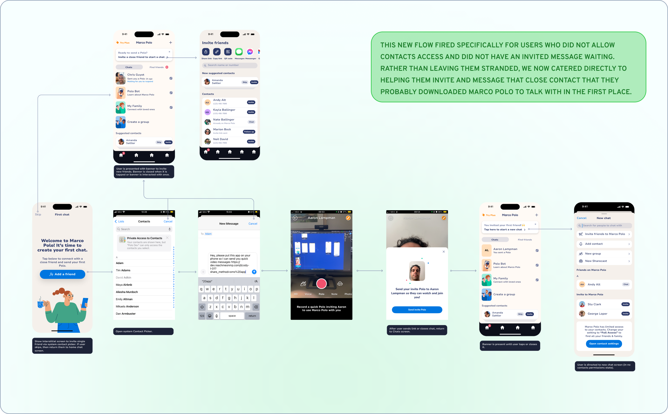 Our goal was to solve the cold start problem for users who entered Marco Polo without any contacts - giving them a clear path to their first conversation instead of an empty, confusing home screen. Here's how I designed a privacy-respecting solution that worked within iOS 18's new permission constraints.